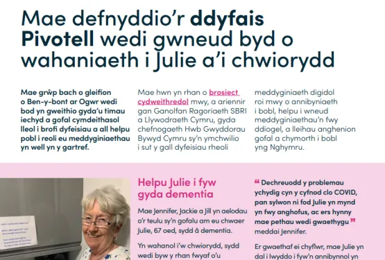 Merch Jennifer, Nicky, sy'n gweithio mewn Hwb Fferylliaeth Gymunedol, a awgrymodd y gallai Julie elwa o gael dyfais rheoli meddyginiaethau. O ganlyniad i atgyfeiriad gan feddyg teulu cafodd Julie ei gwahodd i dreialu dyfais cyflenwi meddyginiaeth Pivotell.
